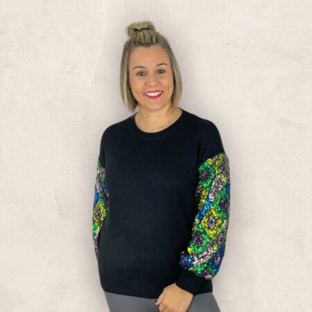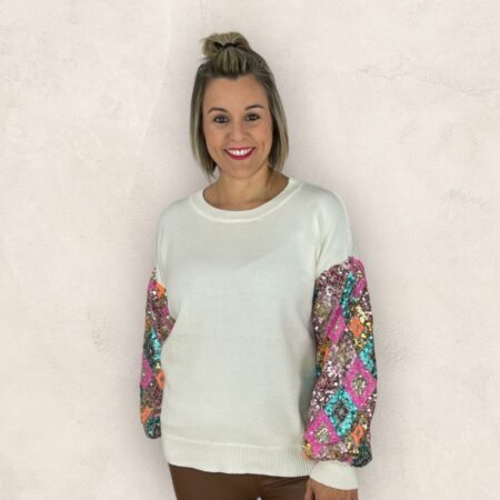 25.95€10.00€ IVA inc.Suéter de punto básico con las mangas en fantasía con lentejuelas de colores.
